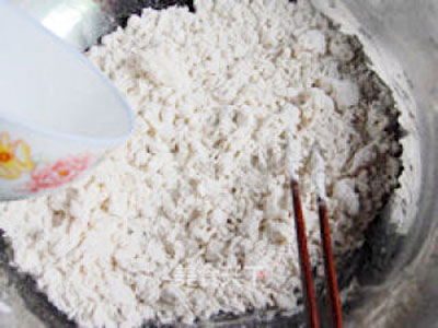 準備一個不銹鋼盆放入500克面粉,將酵母倒進30度左右的溫水里,用筷子攪拌融化,將酵母水倒入,邊倒入邊用筷子攪拌成絮狀。