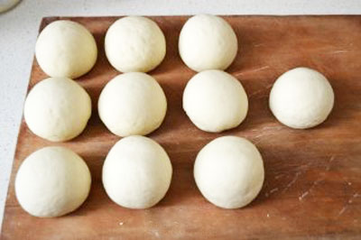 將發酵好的面團取出放在案板上,揉面進行排氣,揉至原來面團的大小。把面團揉成長條狀,用刀切成等份。將分好的等份面團揉成饅頭形狀。
