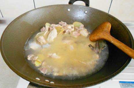 倒入雞塊翻炒,炒至雞肉表面斷生,加入適量米酒(米酒的量就是之后湯的量),三個(gè)加熱開關(guān)全打開,煮至沸騰,沸騰后再煮5分鐘左右。