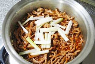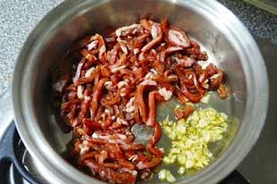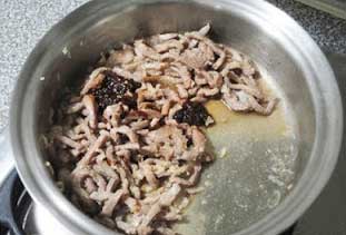 肉絲八分熟(表層白色)時放入蒜末翻炒,然后放入豆辦醬與砂糖翻炒上色。