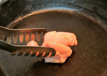 生肥豬肉下鍋,用夾子夾住生肥豬肉,以內圈到外圈的方式呈螺旋狀在鍋內壁不停地擦拭,使溢出的油脂均勻地涂滿整個鍋面。