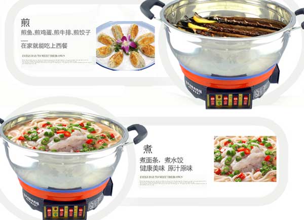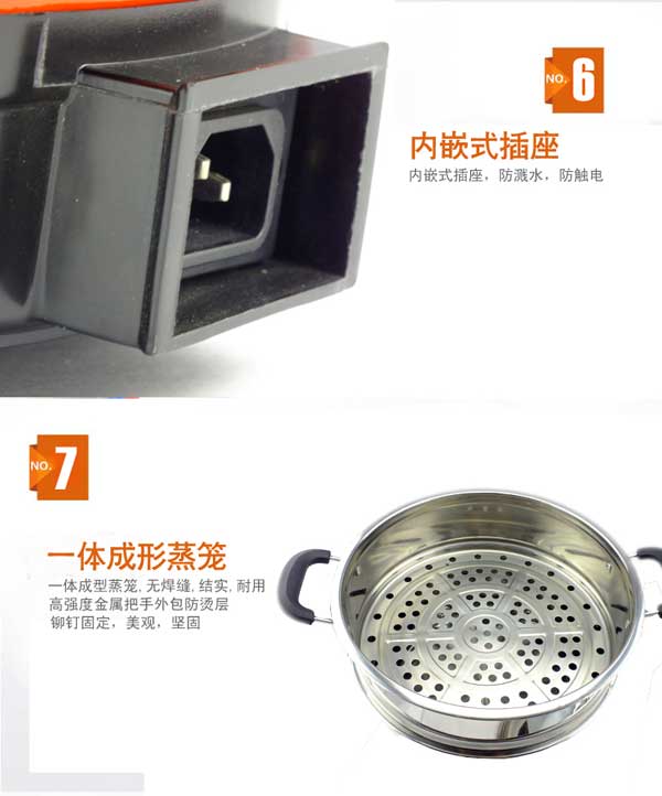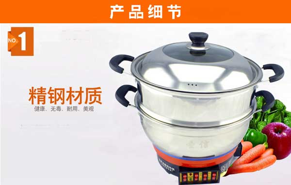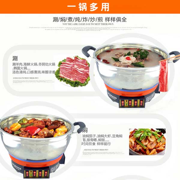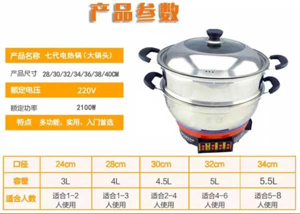 七代大鍋頭電熱鍋,多功能,煎、炸、炒、烙、蒸、燜、涮樣樣精通,鍋體采用不銹鋼制造,蒸籠采用不銹鋼一體成型蒸籠,內部采用三根加熱管獨立加熱,三檔+保溫擋位,內部設有溫控器,可有效防止干燒導致電熱鍋的損壞,結實耐用,美觀實用。