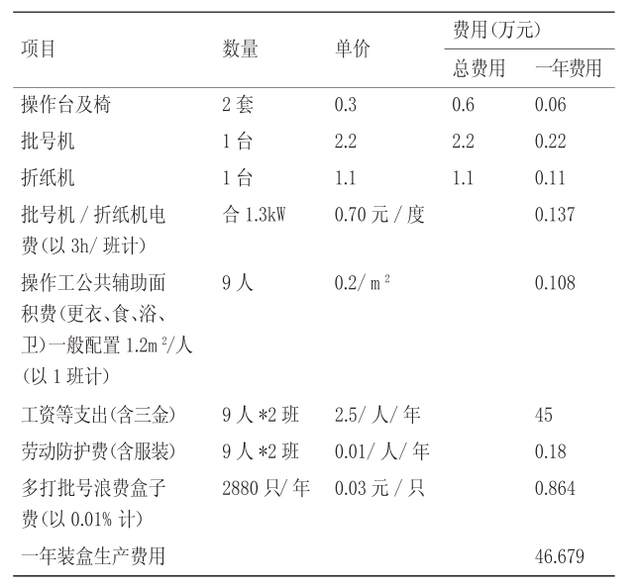 傳統(tǒng)手工裝小盒包裝的產(chǎn)量為60支/min(數(shù)據(jù)來源于某制藥廠軟膏車間),一般需4人/班完成(含折說明書和批號打?。?,若以生產(chǎn)速度120支/min為例,另加1人輔助,則裝小盒工作需9人/班完成,以2(班/天)計算,則一年軟膏劑裝小盒的生產(chǎn)費用,如下圖所示,其中設(shè)備以10年折舊,建筑以20年折舊,工作日250天/年,8h/班計算。