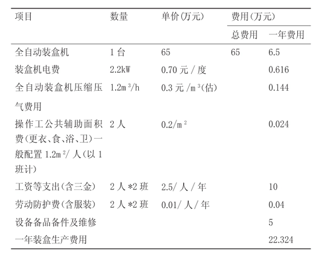 由此看到,對軟膏劑傳統(tǒng)手工裝小盒和全自動裝盒機生產(chǎn)的一年生產(chǎn)費用之差約: