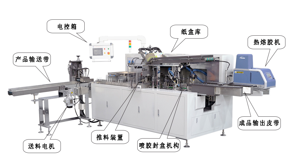 1、采用自動(dòng)送料、開(kāi)盒、噴膠、封盒等包裝形式,結(jié)構(gòu)緊湊合理,操作調(diào)整簡(jiǎn)單。