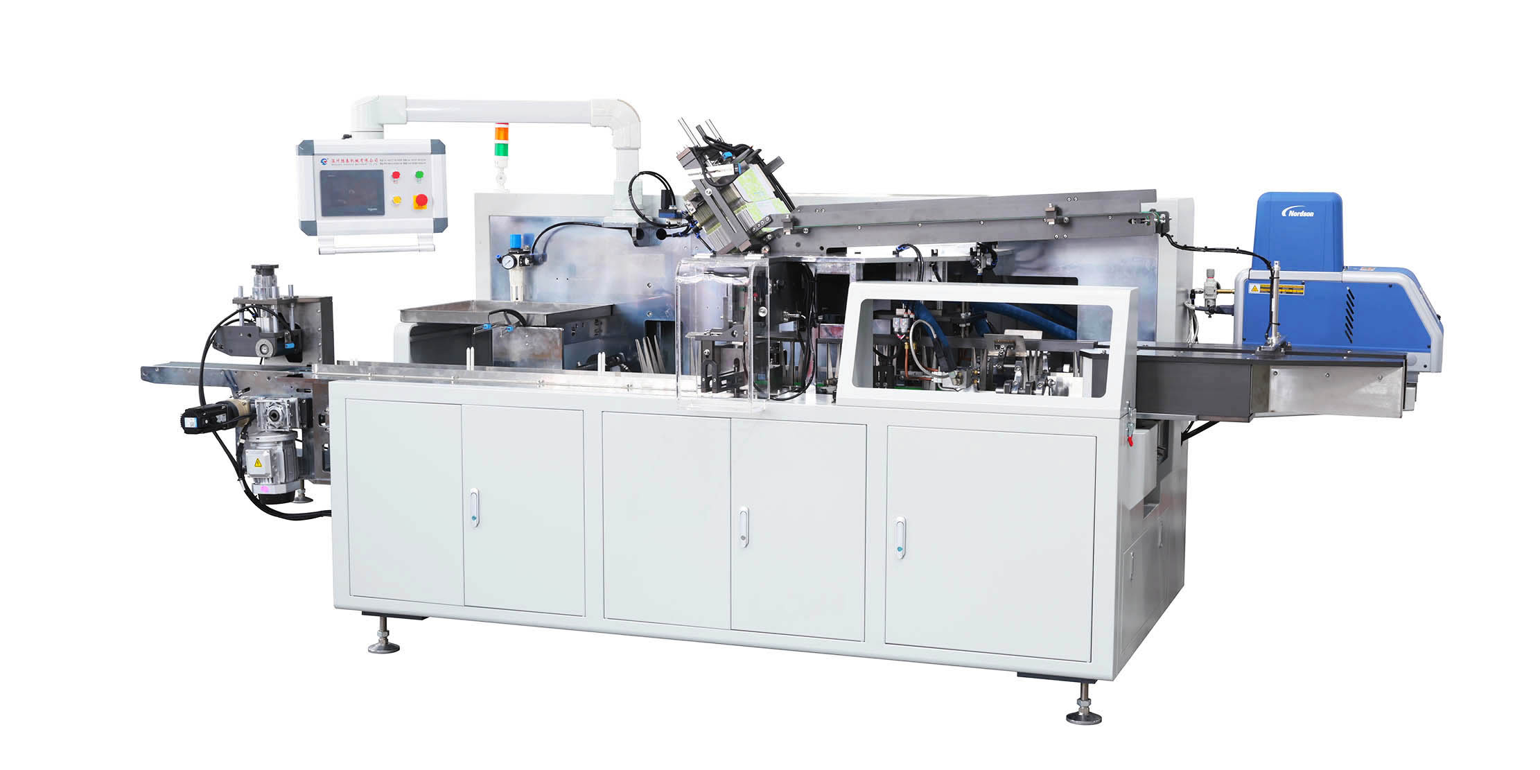 1、采用自動送料、開盒、噴膠、封盒等包裝形式,結(jié)構(gòu)緊湊合理,操作調(diào)整簡單。